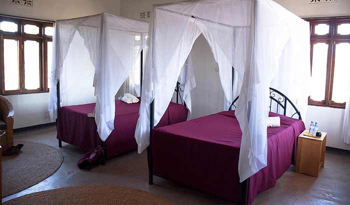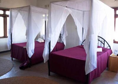 • The lodge has 16 rooms situated in double cottages located in natural vegetation. Each large en-suite room is furnished with a queen bed or two twin beds with netting, chairs, writing table and luggage racks. Lights and hot water are provided by solar power.