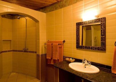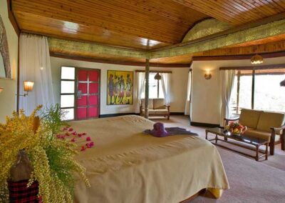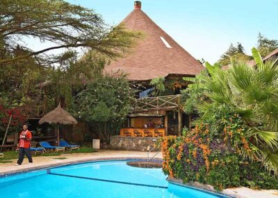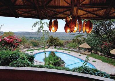 Located high on the slopes of the Oloolaimutia Hills, Masai Mara Sopa Lodge was one of the first safari lodges to be built in the Maasai Mara Game Reserve, a reason why its gardens and trees are so lush and mature. All the buildings follow the design of traditional African round houses with conical roofs, and these stretch along the line of the hills with the impressively large public area buildings and the swimming pool at their centre.