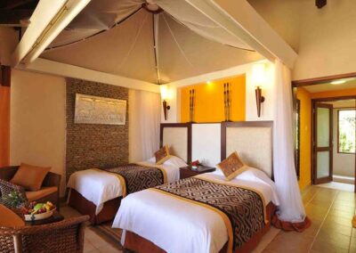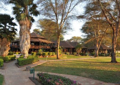 Elegantly furnished and well-appointed, all rooms have fans and mosquito nets and offer great views of Mount Kilimanjaro or the wetlands. With luck, guests can view elephants from the comfort of their own terrace.