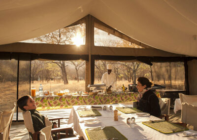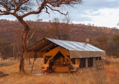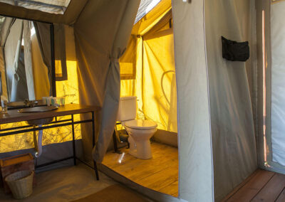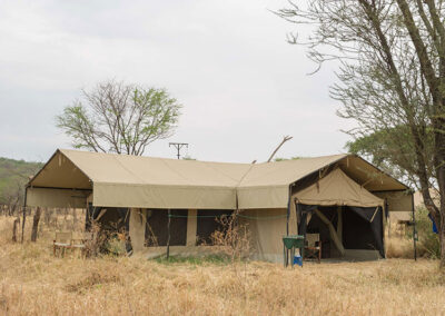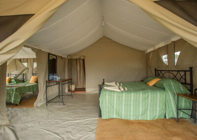 The tents are situated at ground level with a private porch. They overlook the savannah, Ample and comfortable. There is a choice of one double bed or two twin beds. The tents have a bathroom with a bucket shower. The family tent consists of two tents interconnected and a shared bathroom and private porch.